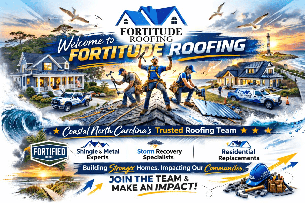 Fortitude Roofing is a coastal North Carolina roofing company specializing in high-performance shingle and metal systems. We focus on residential replacements, storm recovery, and FORTIFIED roofing—on a mission to better our communities through our work.